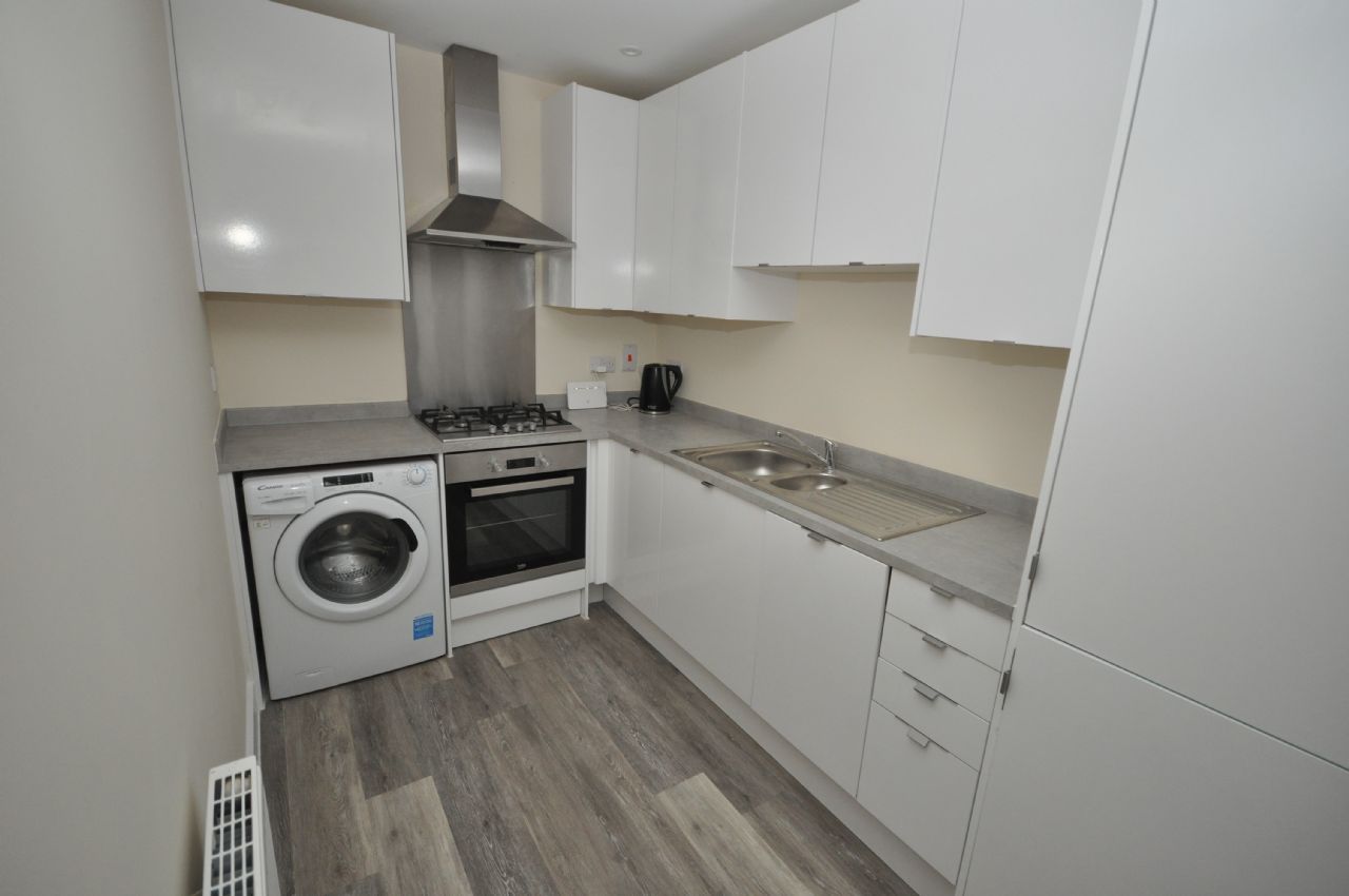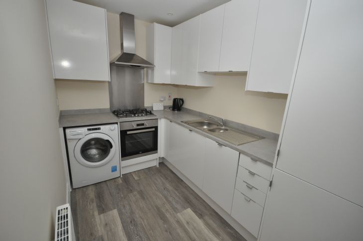 9’7” x 6’5” Stainless steel sink top, single drainer 1 ½ bowls with cupboards under. Wall cabinets. Four ring gas hob, electric oven and cooker hood. Integrated dishwasher. Integrated fridge/freezer. Laminate flooring. Radiator. Spot lights. Power points. UPVC double glazed window to front.