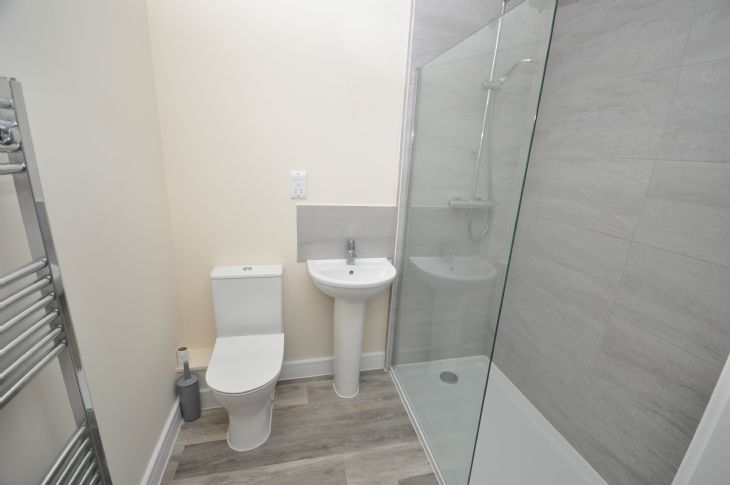 Double fitted shower cubicle with shower. Pedestal wash hand basin. Low level W.C. Radiator. Spot lights. Extractor. Shaver point. Laminate flooring. Part tiled walls.