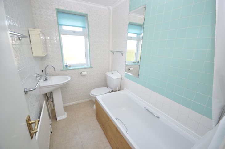 Double glazed window to rear aspect. Panelled bath with shower over. Low level W.C. Pedestal wash hand basin. Fully tiled. Radiator.