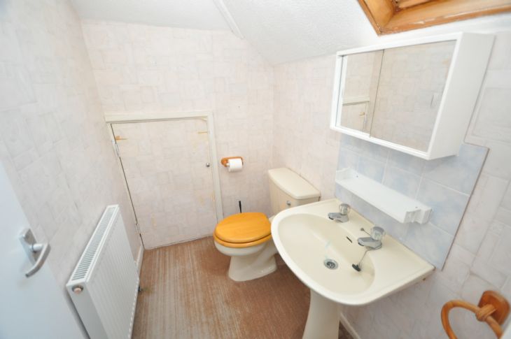 Velux roof window. Pedestal wash hand basin. Low level W.C. Radiator. Doors to eaves storage.