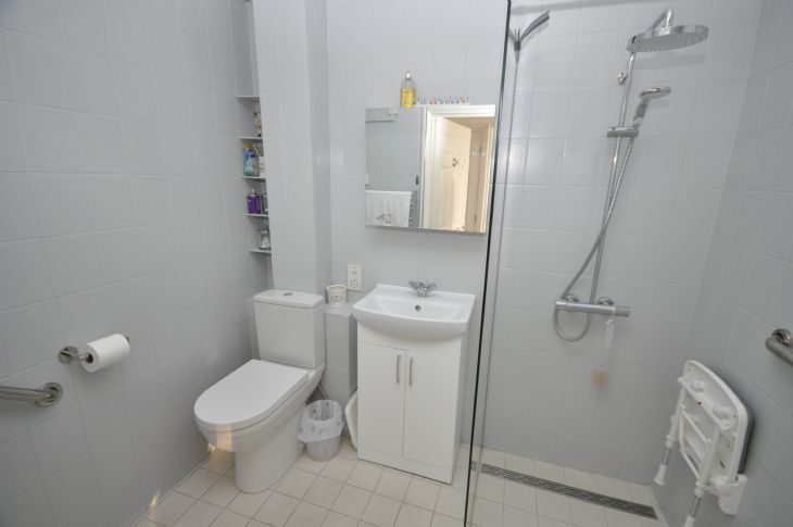 Corner shower with screen. Vanity wash hand basin. Low level W.C. Fully tiled walls. Tiled flooring. Heated towel rail. Light and extractor fan.