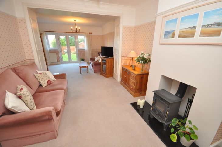 26’8” x 15’6” Fireplace with fitted log burner. Understairs storage cupboard. Two radiators. Double glazed French doors to rear. Two double glazed windows to rear.