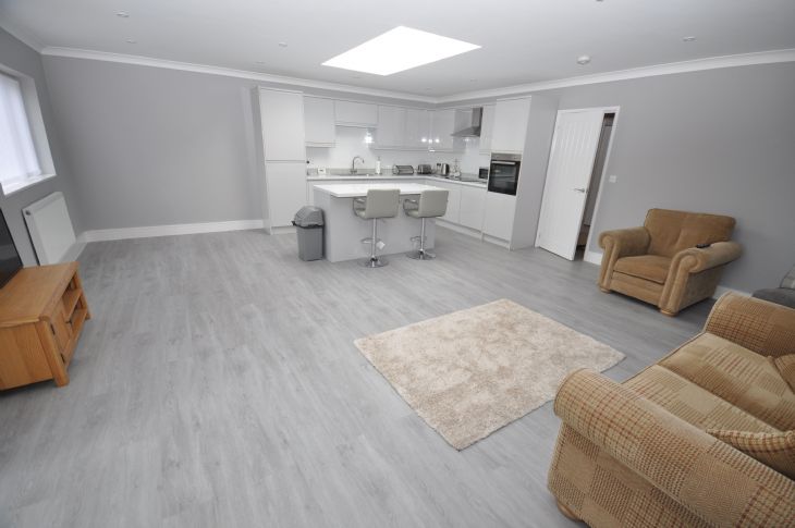 22’4” x 19’9” Inset single bowl, single drainer stainless steel sink unit with mixer tap. Marble effect work surfaces with cupboards and drawers under. Wall units. Inset ceramic hob with stainless steel extractor over. Built-in oven. Integrated fridge, freezer, dishwasher and washing machine. Large central island unit. Inset spot lighting. Vinyl flooring. Two radiators. Double glazed window to rear. Double glazed patio doors to rear leading to large decking area.