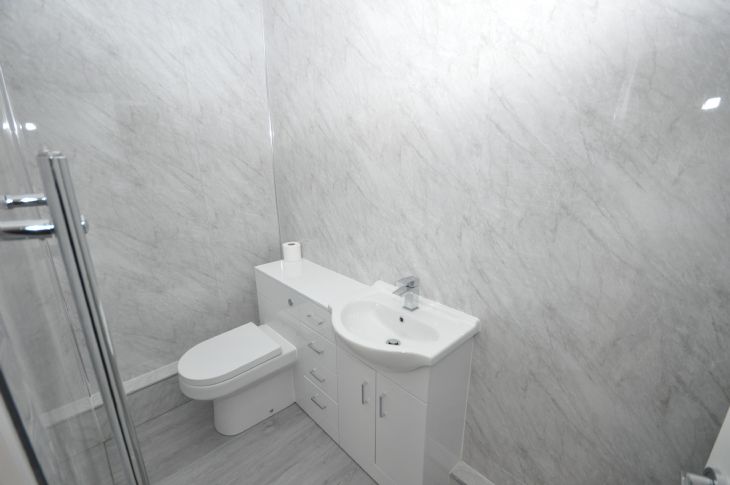 Large shower with glazed doors. Low level W.C. Vanity wash hand basin. Vinyl flooring. Heated towel rail. Extractor.