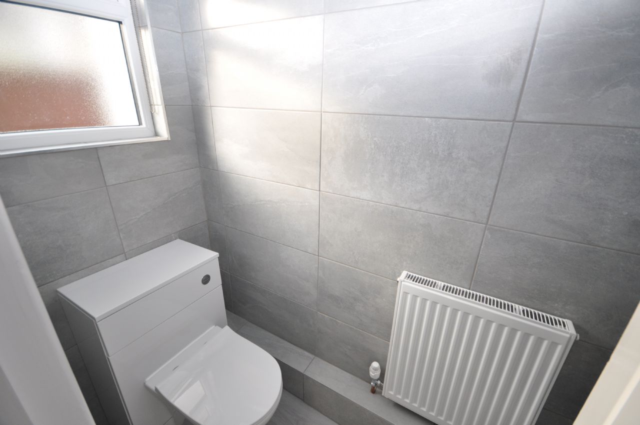 Low level W.C. Vanity wash hand basin. Fully tiled walls. Vinyl flooring. Radiator. Double glazed window to side.