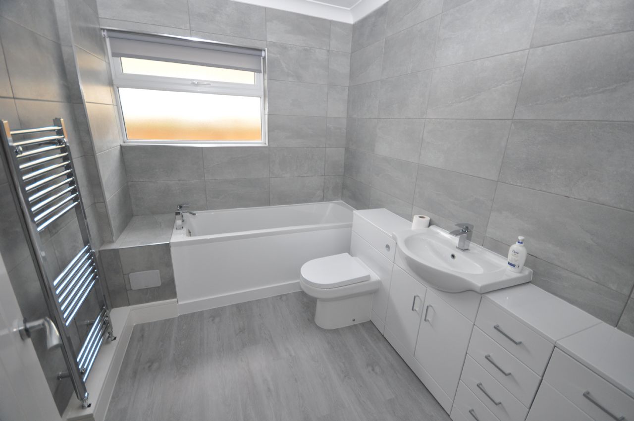Panelled bath with mixer tap. Low level W.C. Vanity wash hand basin. Vinyl flooring, Heated towel rail. Double glazed window to side.