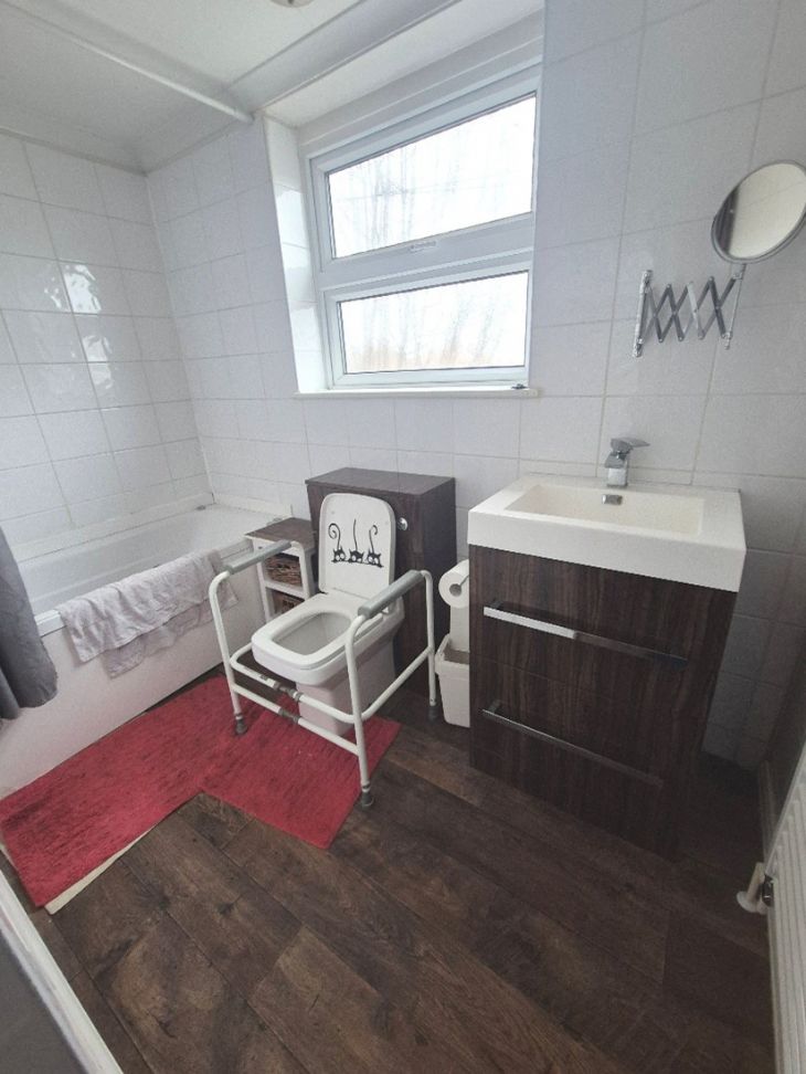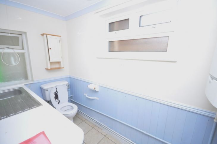 Panelled bath with shower attachment. Low level W.C. Vanity wash hand basin. Tiled walls. Radiator. Double glazed window to rear.