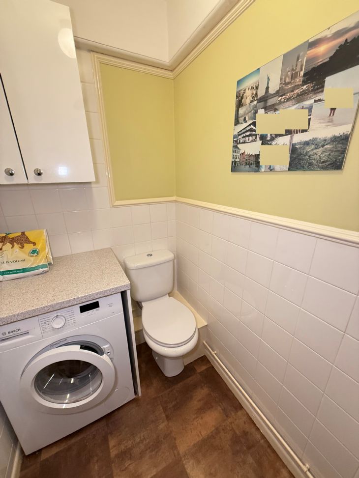 Low level W.C. Wash hand basin. Worktop with space for washing machine under. Part tiled walls. Wall cabinet.