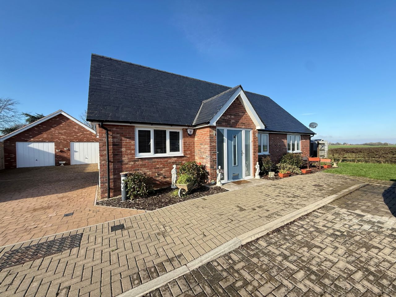 Block paved front and driveway, large enough for multiple vehicles, leading to large Garage / Workshop. Shrub borders set in woodchip to either side of the Entrance door and extending in front of the windows.