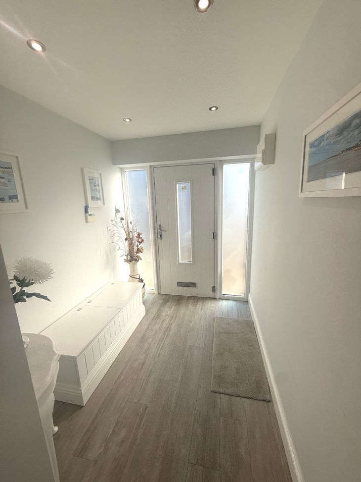 Spacious hallway. Double glazed front door with obscure double glazed glass panel to either side. Built in cupboard housing hot water tank. Power points.