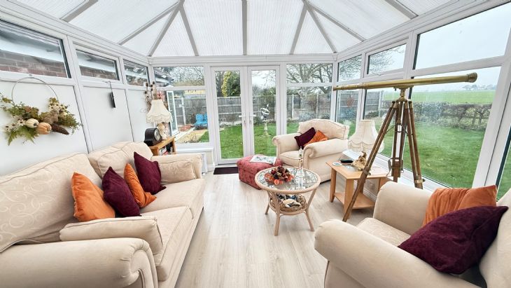 16’3” x 14’2” Power points. TV aerial point. Double glazed French doors leading to Garden, with panoramic farmland views. Double glazed French doors to Conservatory.