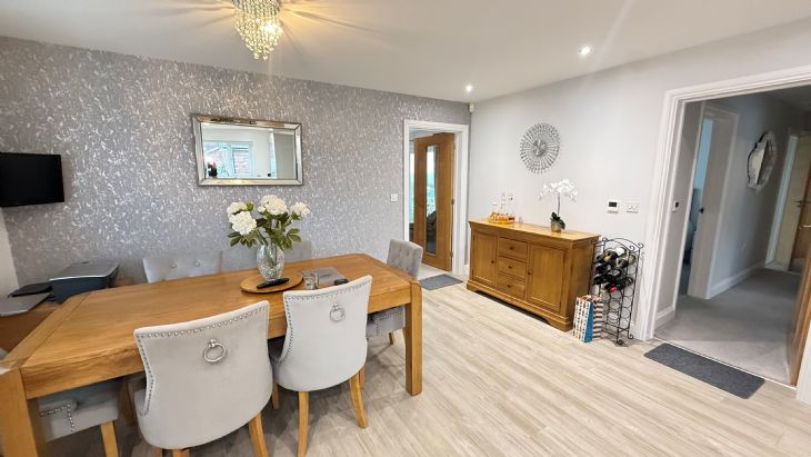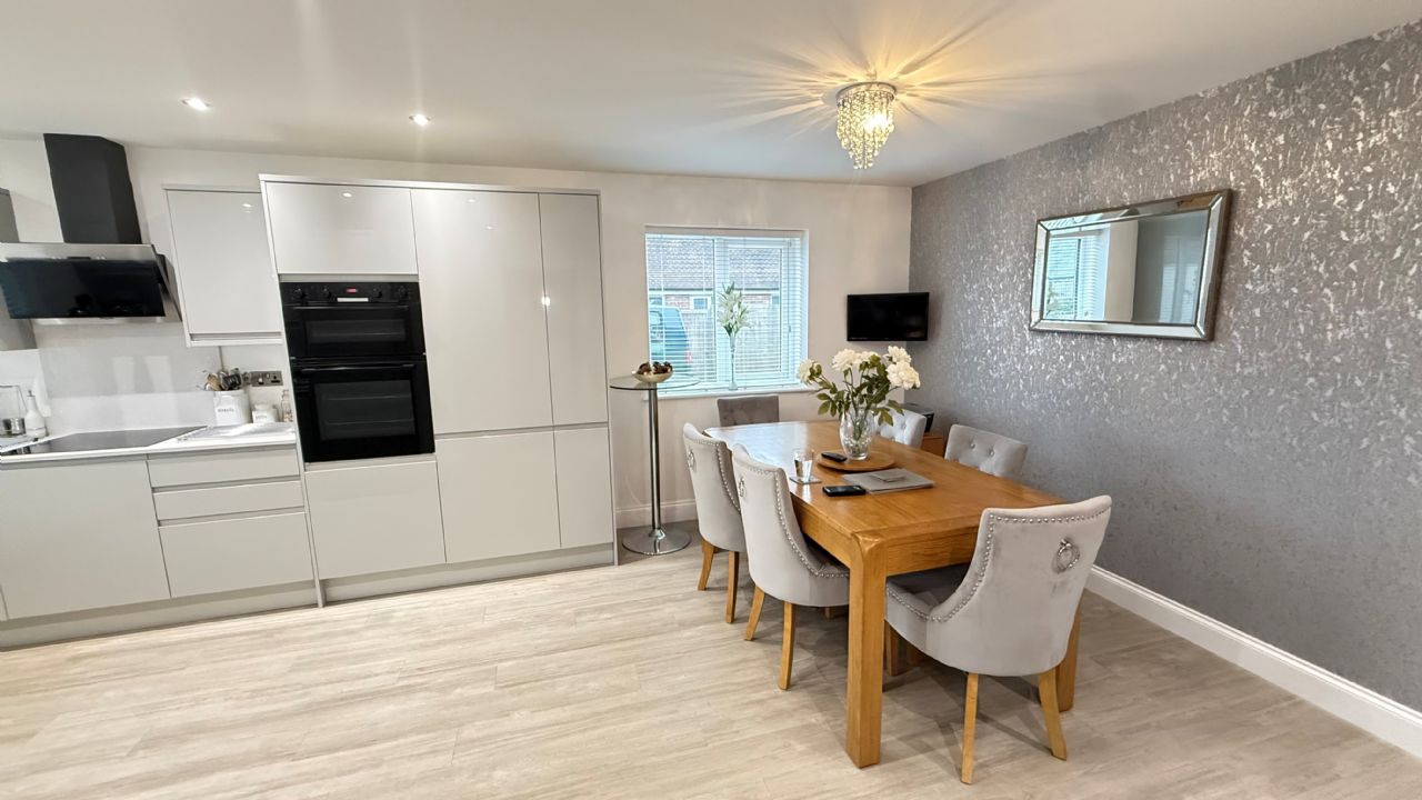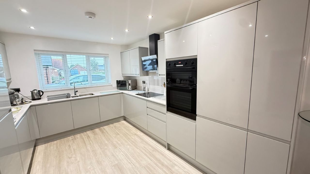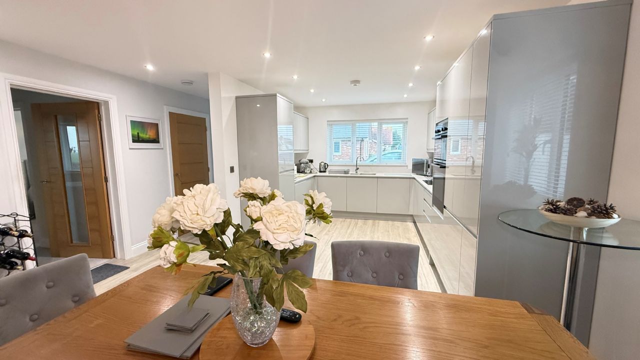 20’8” x 14’4” reducing to 10’3” Stainless steel sink unit with 1 ½ bowl and cupboards under. Hotpoint induction hob with extractor over. Bosch double oven. Large Quartz worktop surfaces with soft closing gloss grey cupboards and drawers under. Matching eye level units. Integrated Bosch dishwasher, Hotpoint fridge and freezer and Hotpoint washing machine / dryer. Larder cupboard housing wall mounted gas Valiant boiler. Spot lights. Power points. UPVC double glazed windows to front and side. Doors to Lounge and second Hall.