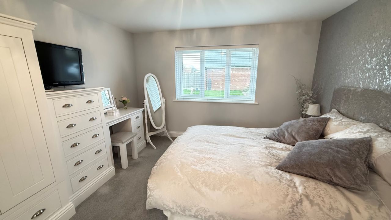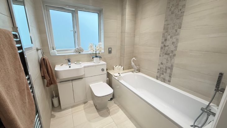 6’7” x 6’7” Panelled bath with mixer tap and attachment. Vanity wash hand basin. Low level W.C. Tiled walls. Tiled flooring. Heated towel rail. Shaver point. Extractor fan. UPVC double glazed window.