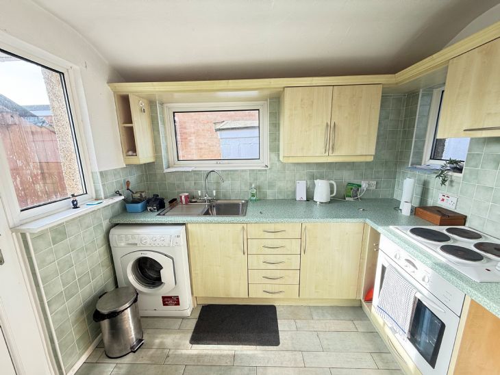 9’ x 7’ Stainless steel sink top, single drainer with cupboards under. Worktop unit. Wall cabinets. Electric hob with oven under. Cooker hood. Plumbing for washing machine. Tiled flooring. Part tiled walls. Power points. Double glazed window and door leading to rear garden.