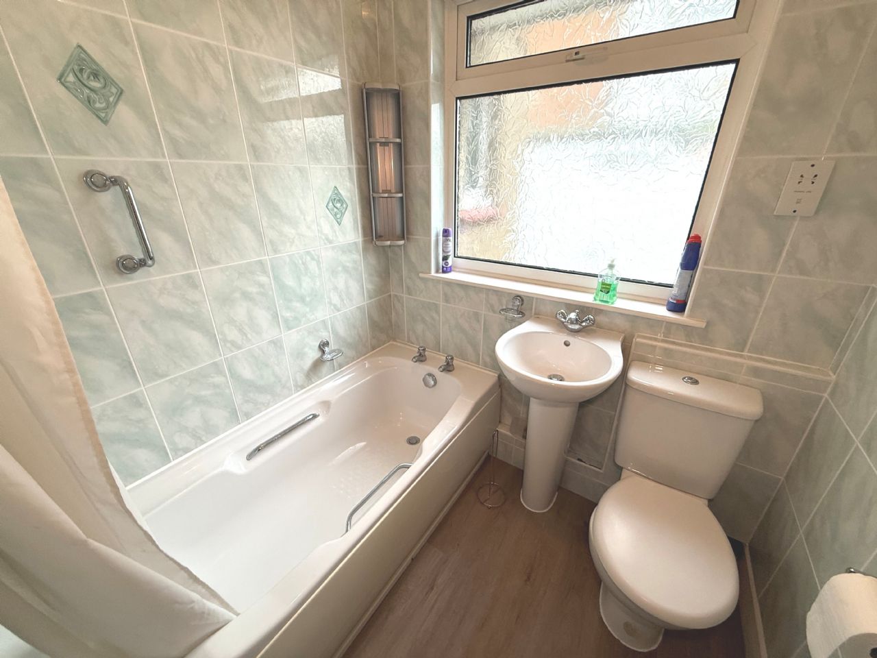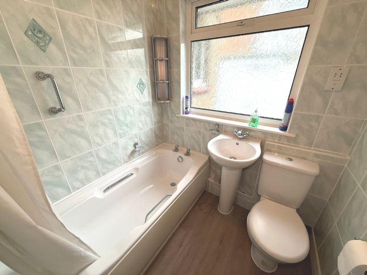 Panelled bath with Triton electric shower (not working). Pedestal wash hand basin. Low level W.C. Shaver point. Radiator. Tiled walls. Double glazed window.
