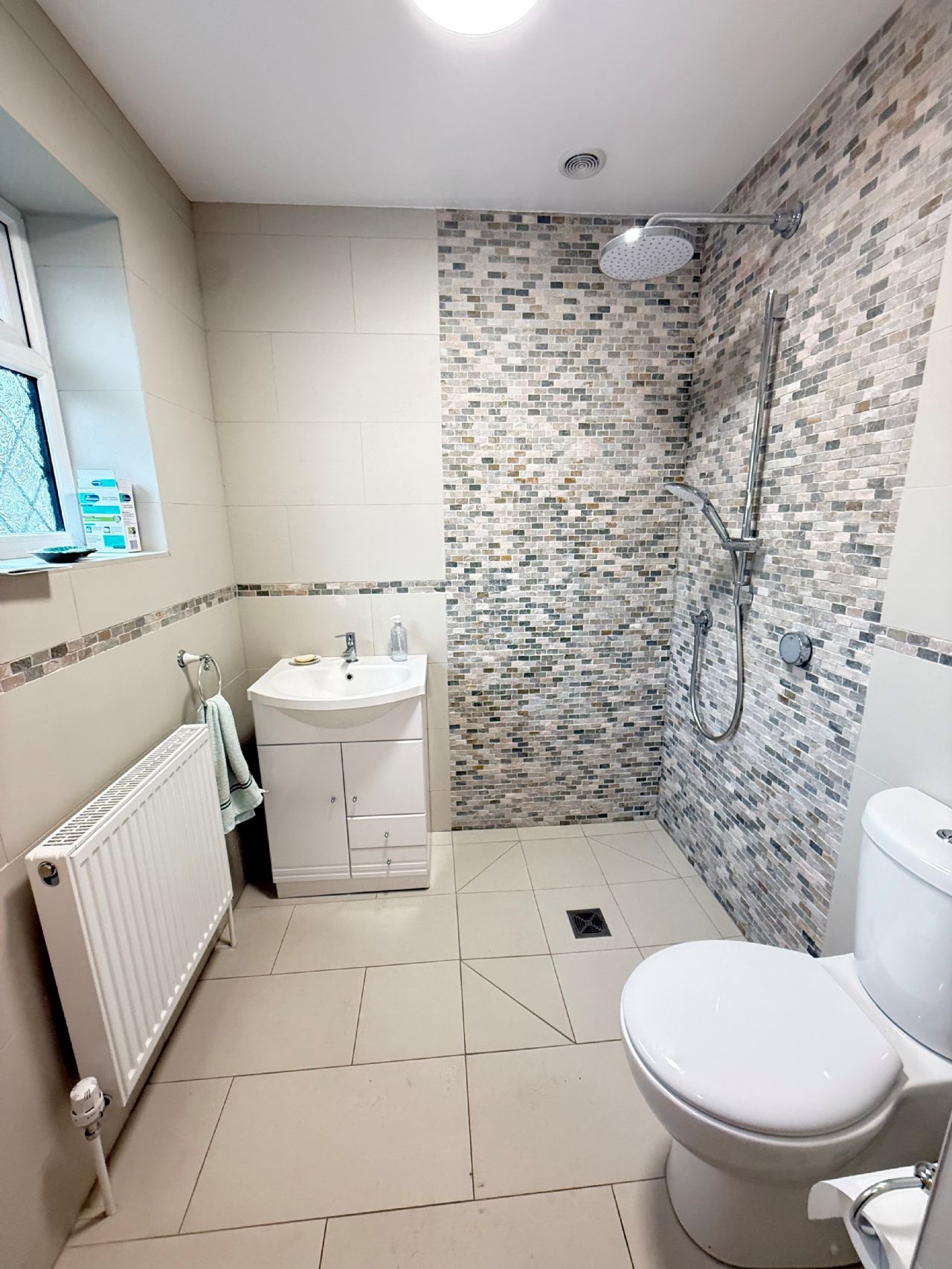 Fitted shower. Vanity wash hand basin. Low level W.C. Radiator. Tiled walls. Double glazed window.