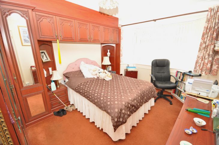 14’ (into bay) x 10’5” Range of built-in wardrobes with mirrored doors. Radiator. Double glazed bay window to front.