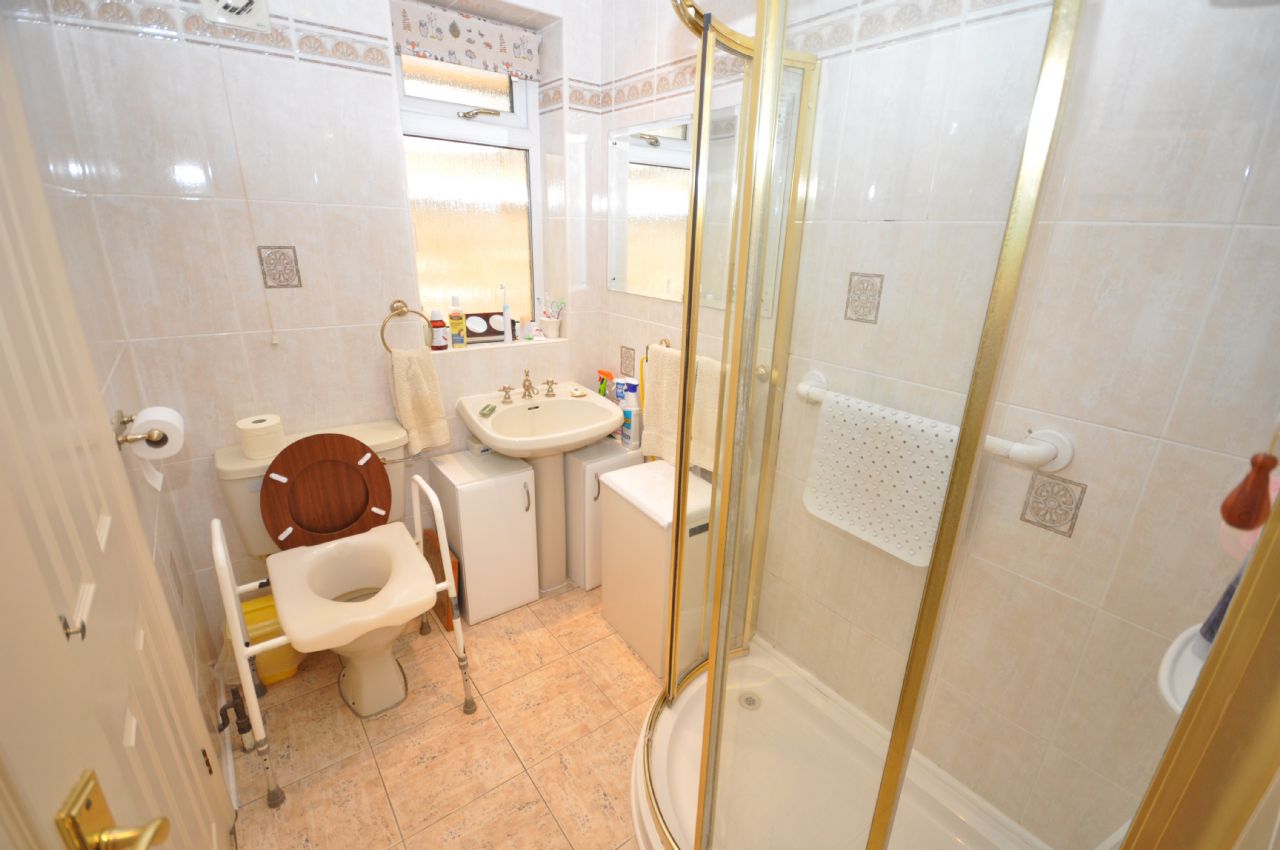 Tiled corner shower cubicle with electric shower. Pedestal wash hand basin. Low level W.C. Fully tiled walls. Tiled flooring. Airing cupboard. Double glazed window to side.