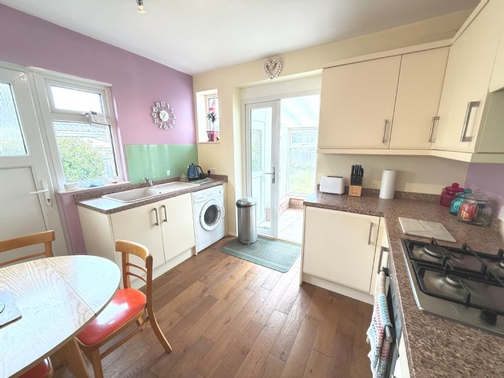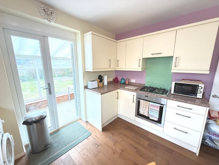 10’ 5” X 10’. Single drainer sink unit with cupboards under. Worktop unit with cupboards and drawers under. Matching wall cabinets. Four ring gas hob. Electric oven and cooker hood. Plumbing for washing machine. Cupboard housing gas boiler for domestic hot water and central heating. Double radiator. Power points. Double glazed window and door to side. Matching double glazed french doors leading to conservatory.