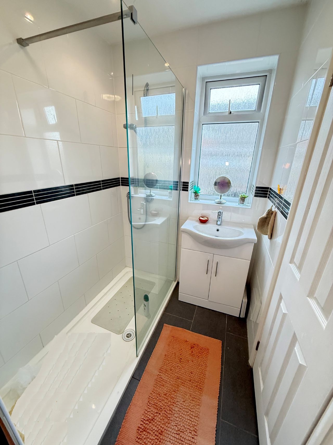 Fitted double shower cubicle with shower. Vanity wash hand basin. Chrome radiator. Fully tiled walls. Airing cupboard with lagged copper cylinder and immersion heater. Tiled flooring. Double glazed window.
