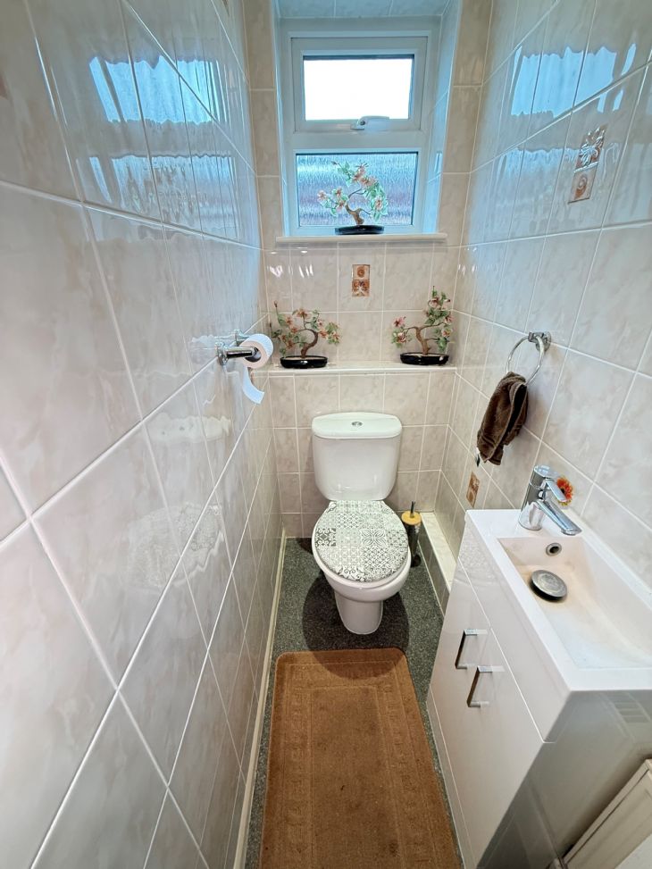 Low level suite. Wash hand basin. Tiled walls. Radiator. Double glazed window.