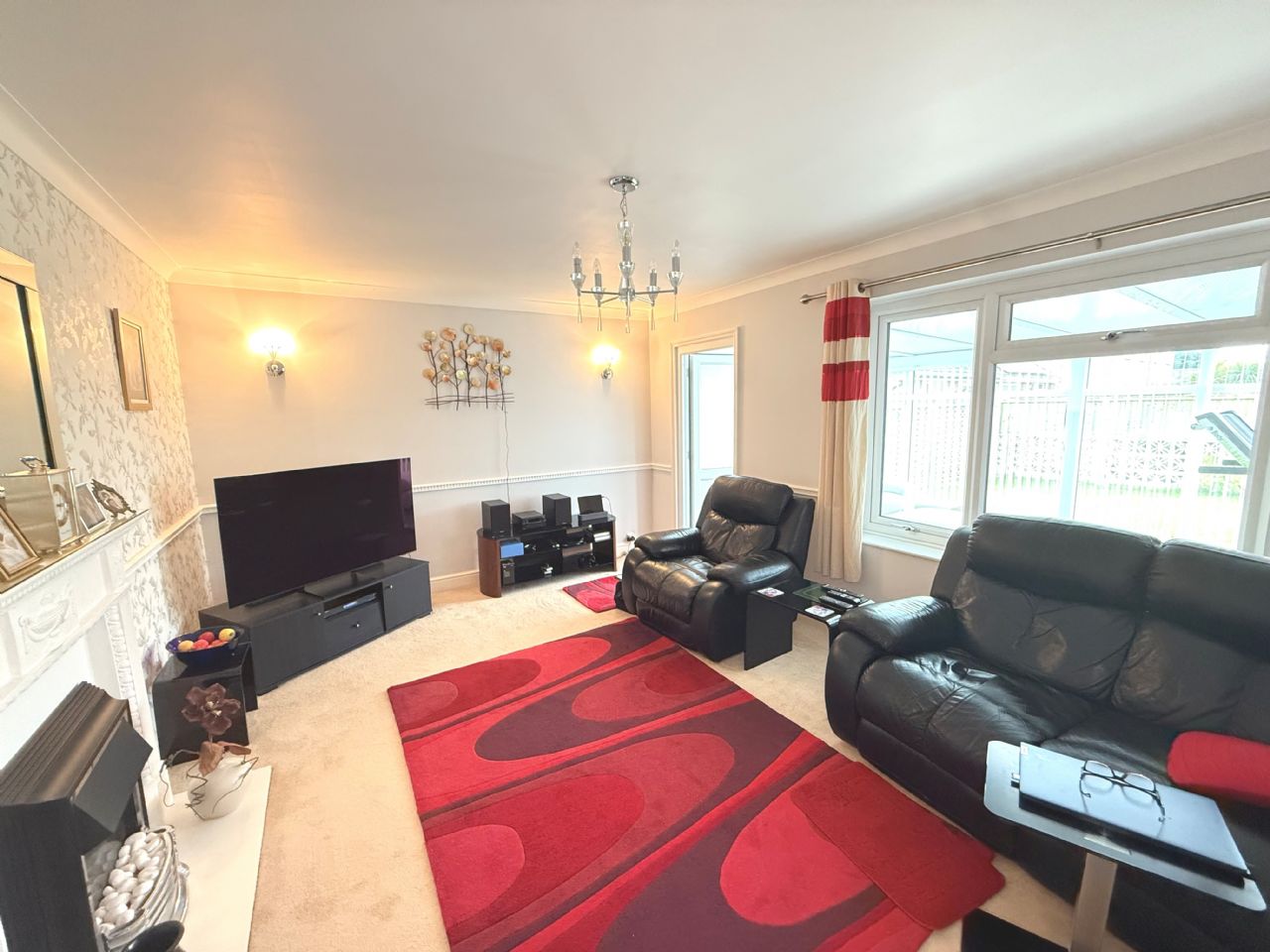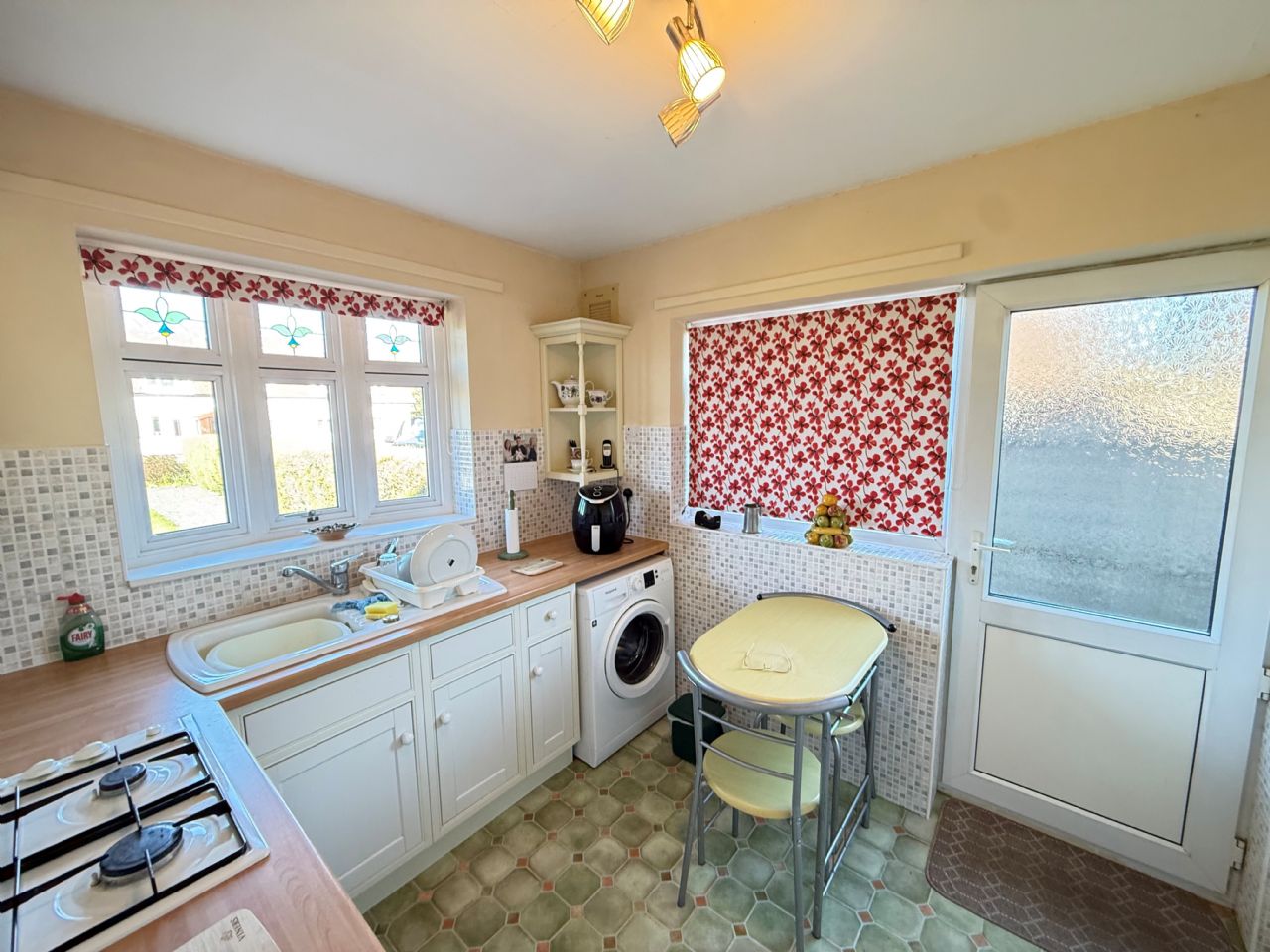 10’ 5” X 10’. Single drainer sink unit with cupboards under. Worktop unit with cupboards and drawers under. Matching wall cabinets. Four ring gas hob. Electric oven and cooker hood. Plumbing for washing machine. Cupboard housing gas boiler for domestic hot water and central heating. Double radiator. Power points. Double glazed window and door to side. Matching double glazed french doors leading to conservatory.