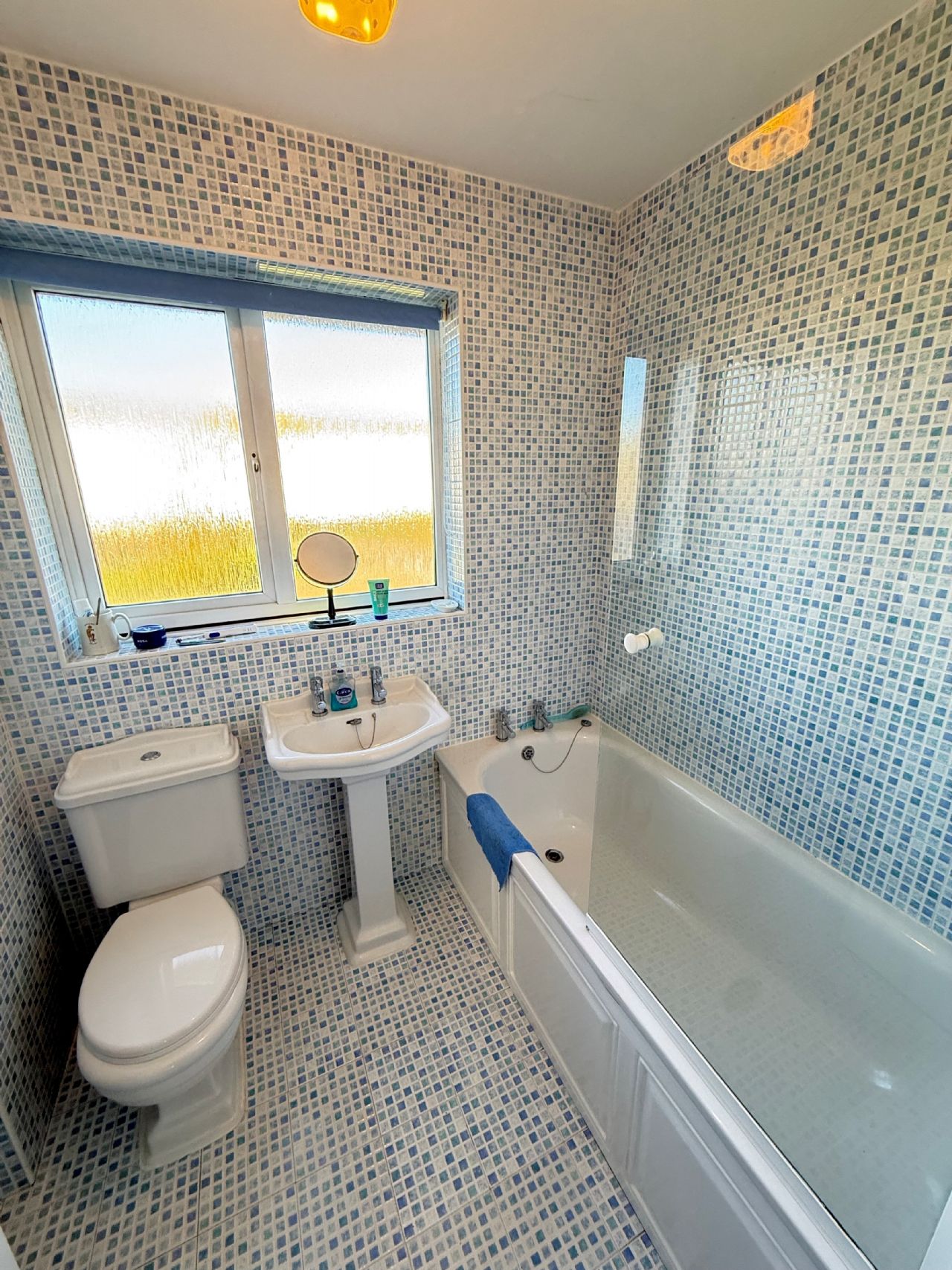 Fitted double shower cubicle with shower. Vanity wash hand basin. Chrome radiator. Fully tiled walls. Airing cupboard with lagged copper cylinder and immersion heater. Tiled flooring. Double glazed window.