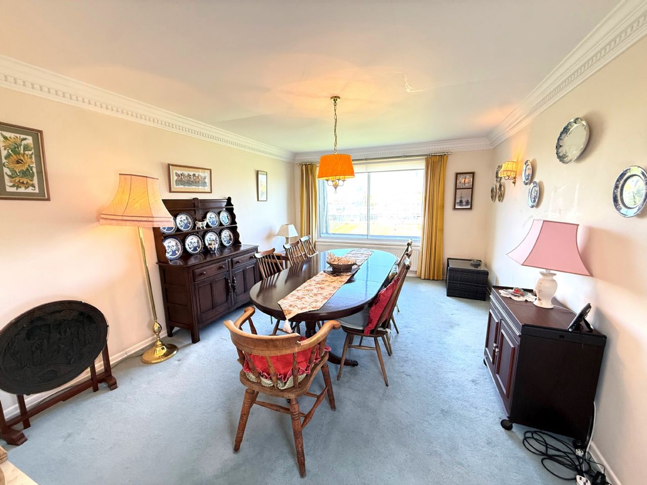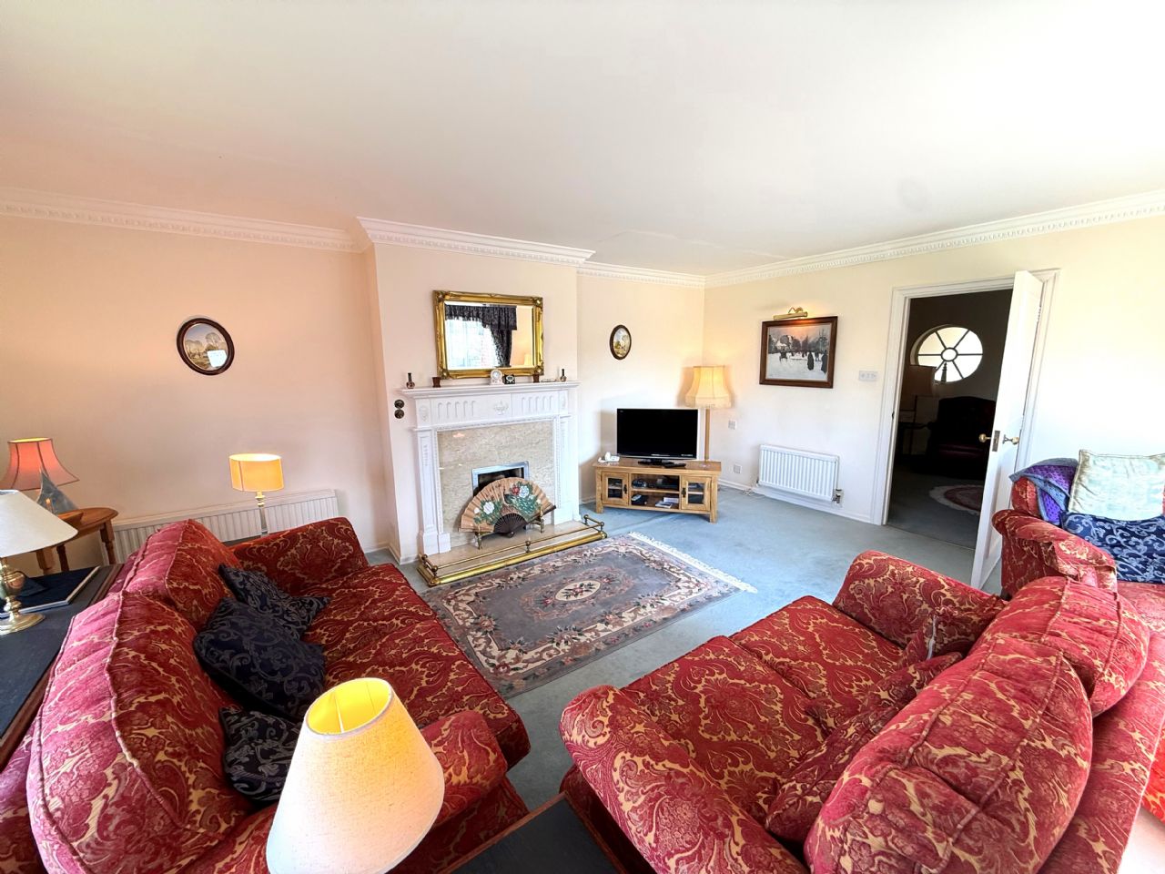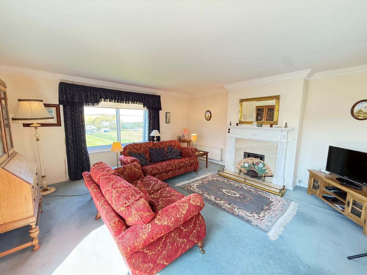 19’8” x 16’2”. Gas fire with attractive surround. Two double radiators. Power points. TV aerial point. Double glazed window to rear with superb views of Frinton Tennis Club and across the open countryside towards Great Holland. Triple glazed sliding patio door leading to main balcony.