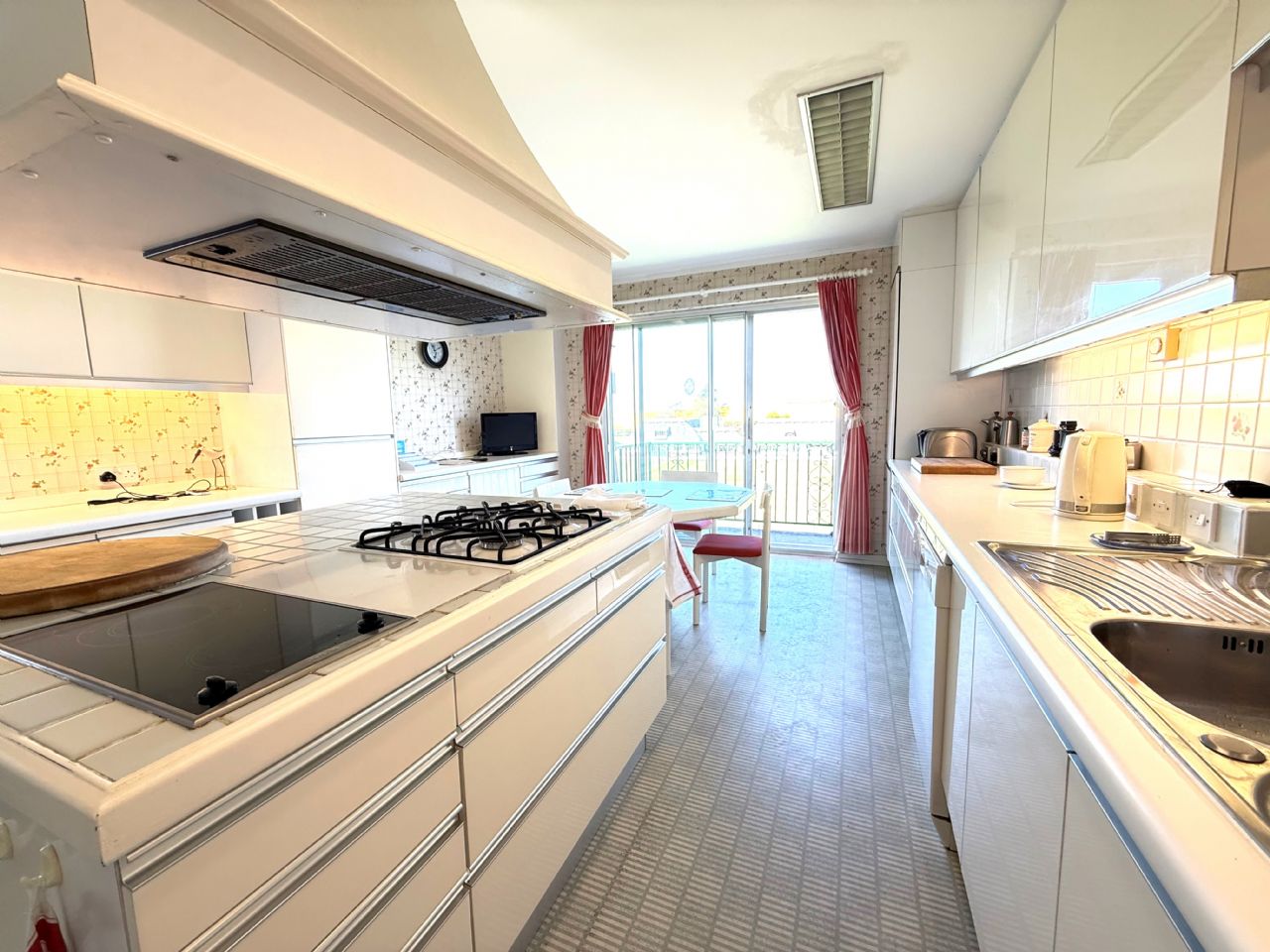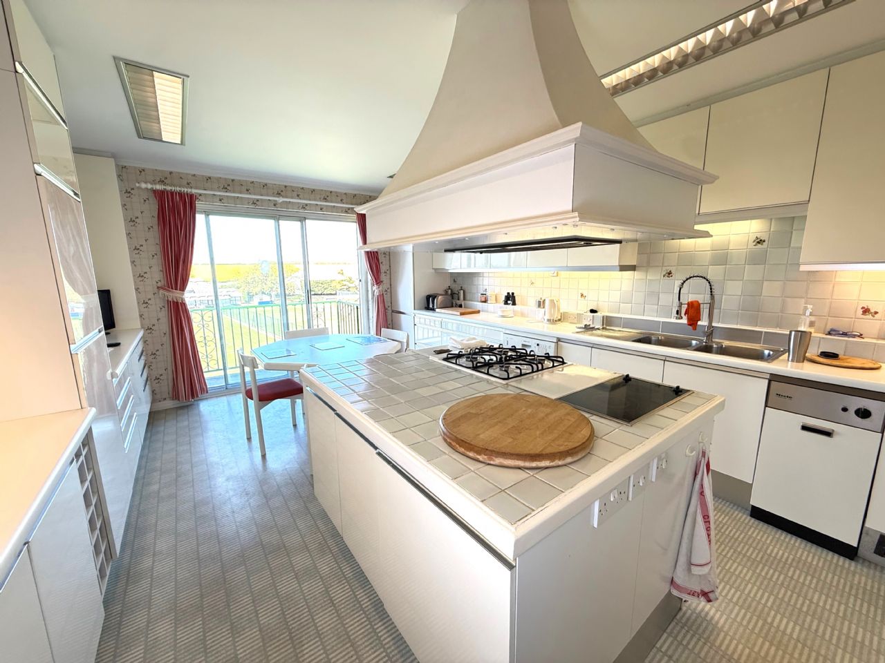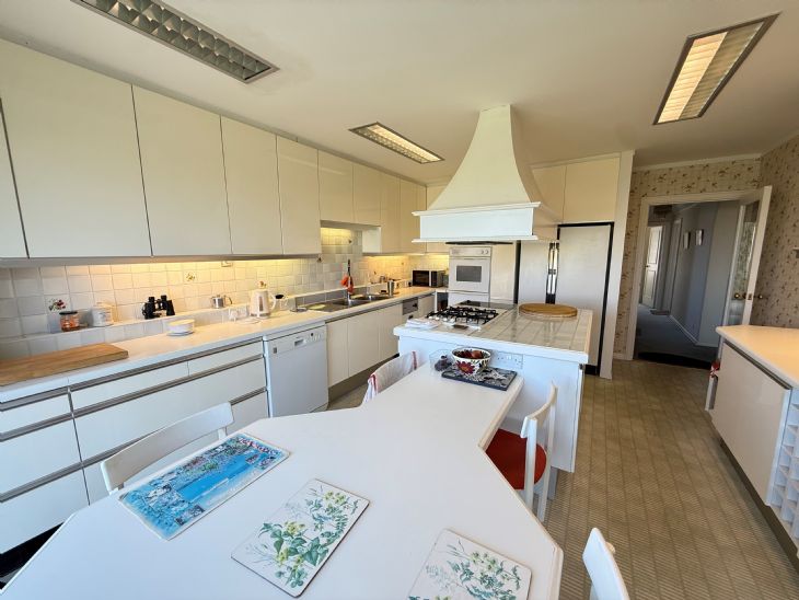 16’5” x 13’. Stainless steel sinktop with single drainer and double bowl. Cupboards under. Three worktop units with cupboards and drawers under. Large range of matching wall cabinets. Central island with 4 ring Neff hob. Matching heat plate. Oven and cooker hood. Integrated dishwasher. Space for fridge freezer. Part tiled walls. Power points. Larder cupboard. China cupboard. Triple glazed sliding patio doors leading to second balcony.
