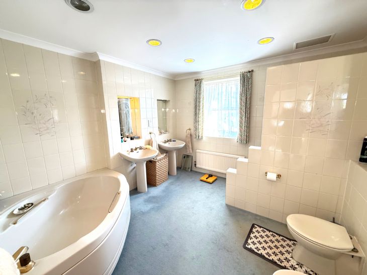 10’7” x 10’6”. Fitted corner bath. Separate fitted shower cubicle with shower. His and hers pedestal wash hand basins. Low level W.C. and bidet. Double radiator. Tiled walls. Light and shaver point. Heated towel rail. Extractor fan. Double glazed window.