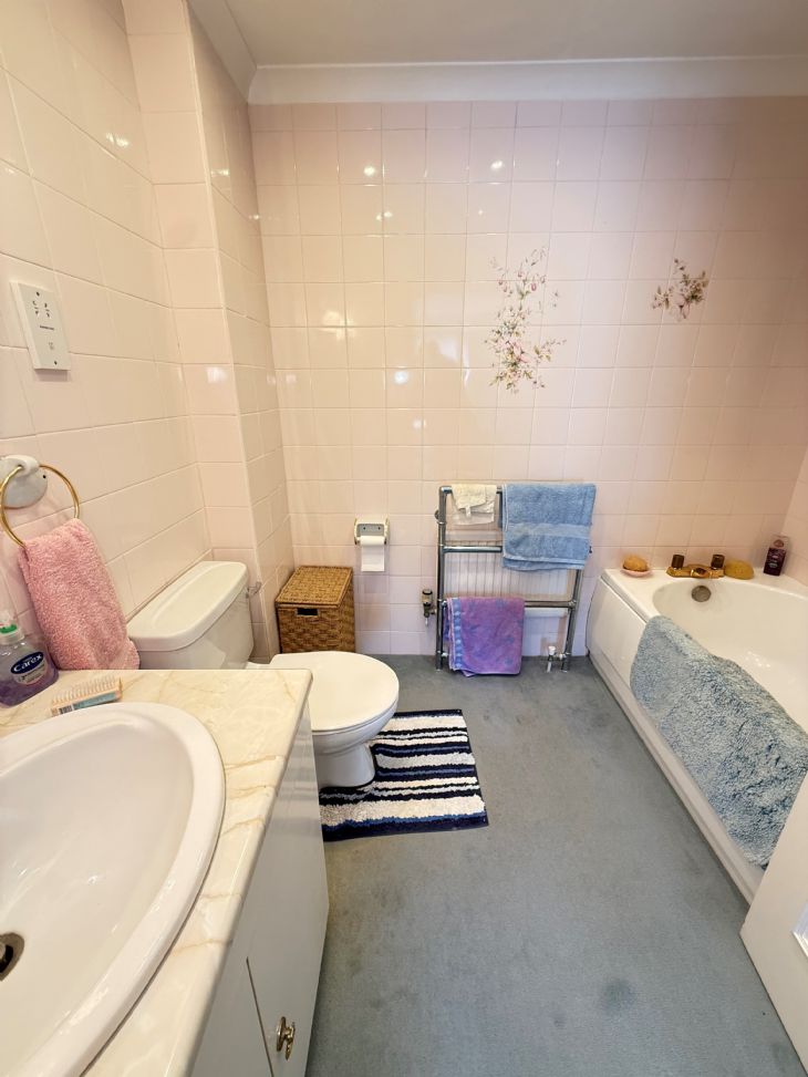 Panelled bath. Vanity wash hand basin. Low level W.C. Heated towel rail. Fully tiled walls. Light and shaver point. Extractor fan.